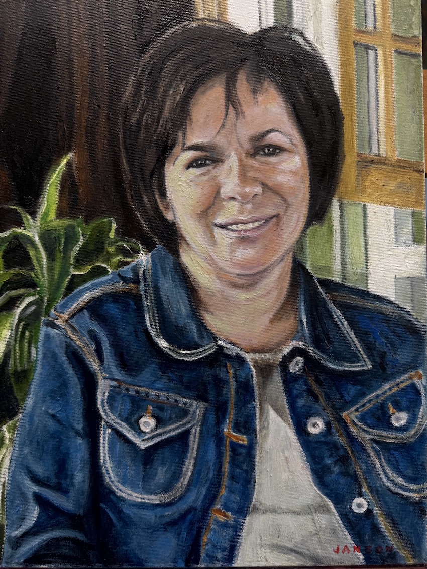 I initially worked from a photograph I took in Cobourg, Ontario. We had a late lunch sitting outside on a cafe before heading home that day. What appealed to me was the way the late afternoon daylight landed on her face. I also liked the casual attire and her smile.