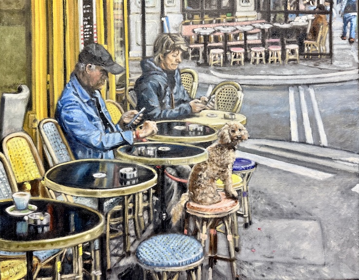 This is probably the worst sales pitch ever. The second painting of mine to be completed in 2026 has to be among the saddest I’ve ever done, although I have been thinking about it since I snapped a photo of two people in a Paris cafe who seemed to be totally absorbed in their cell phones.
