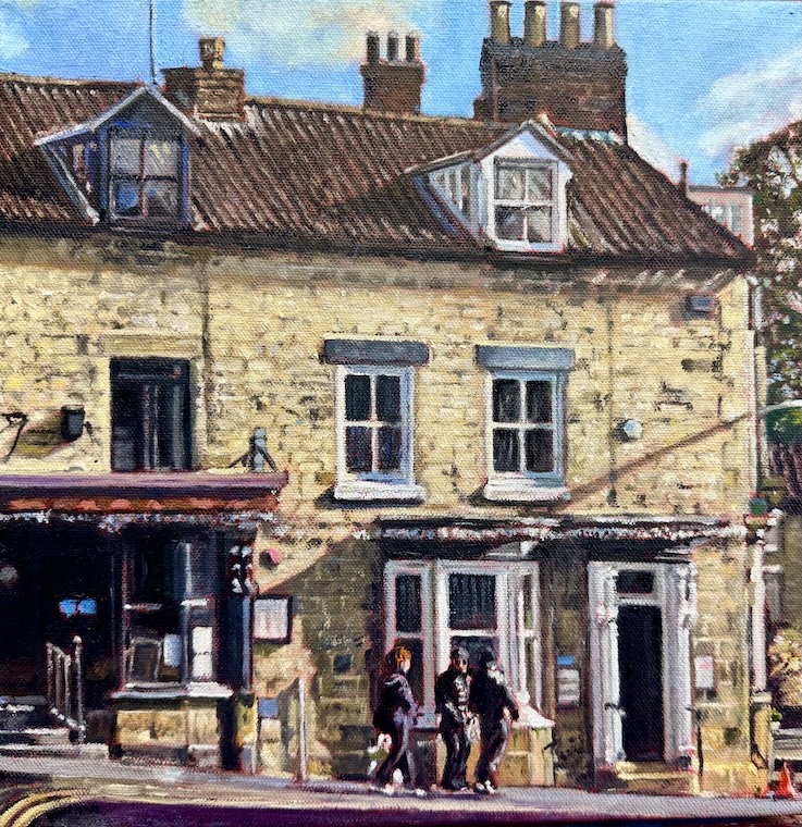 The second painting finished this week is of Pickering, UK. When we travelled to Yorkshire last autumn, many of the place names sounded very familiar. If you head west from where we live in Oshawa, Ontario, you run first into Whitby, then a little later Pickering and Scarborough. All of those are taken from their Yorkshire cousins. We were in Pickering prior to taking an antique steam train — the Flying Scotsman — from Grosmont back to Pickering. It was among the first runs of that train along the North York Moors Railway. Hundreds of people lined up beside the track to get a glimpse of it in operation. Unfortunately, being in the train made it hard to see, well… the train. But we did have a good time beforehand in Pickering, wandering through its impressive but compact High Street. It also has an incredible church with wall paintings that are definitely worth seeing. I took a lot of photos there thinking they would make good painting subjects, especially with the long light that was illuminating the buildings. I had initially drawn out this subject well — I use the grid method for placing my subjects on the canvas — but somehow the top two windows in the eves didn’t align with the windows below. When I double checked, I realized that this was not an anomally of the building, but an anomally of my painting. While the building had obviously undergone many changes over its life, the windows did still line up from top to bottom. A ruler fixed the problem, and suddenly I felt the painting worked. I do like the composition on this one, with the human activity low down on the canvas. Oddly one of the elements that I think really helps this image is the orange cone on the bottom right hand corner. For some reason it feels like a punctuation on the image.