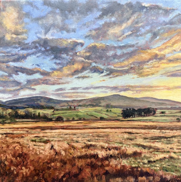 The last of the small paintings — Between Dundee and Dunblane — is a departure for me. I sometimes get complaints that I’m not a true landscape painter given my penchant for portraying architecture, often populated by a stage set of people and bicycles. Some people might just call that an urban landscape, but I digress. My art is not always easy to pigeonhole. I was taken by the colours in this painting, but regret that the horizon falls somewhere towards the center of the picture. I tried moving it one way or another, but I think in the end the land and sky operate in complementary blocks. The composition reminds me a little of some of Mark Rothko’s work. Funny how this push and pull between the abstract and representational always happens with me. Part of what does make it work is the use of complementary colours — the heavy use of orange and blue. While this fits more comfortable within the landscape genre, it does feel very abstract to me.